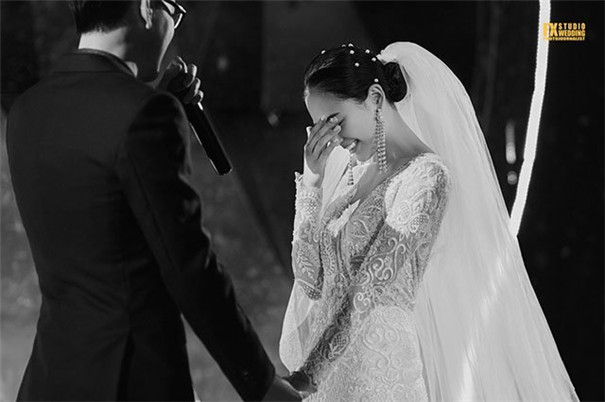 仪式过程中,一切的注意力都集中在人的情绪和一举一动上,那为何不在仪式之前专门为新人拍几张“舞台婚照”呢?女孩身着美丽的嫁衣,在精致的场布与美妙的光线下,即将成为幸福的新娘。此时时间极其有限,要迅速调整好光线、位置、构图以及人物姿态。